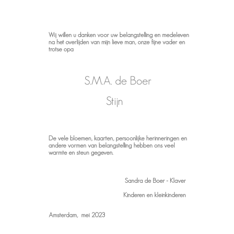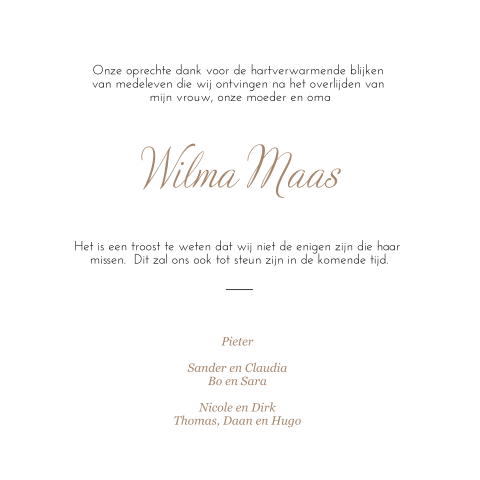 De tekst op de rouwkaart is heel erg graag willen we u dankzeggen voor het medeleven, de bloemenhulde en de troost die we mochten ontvangen na het overlijden van onze lieve (naam).